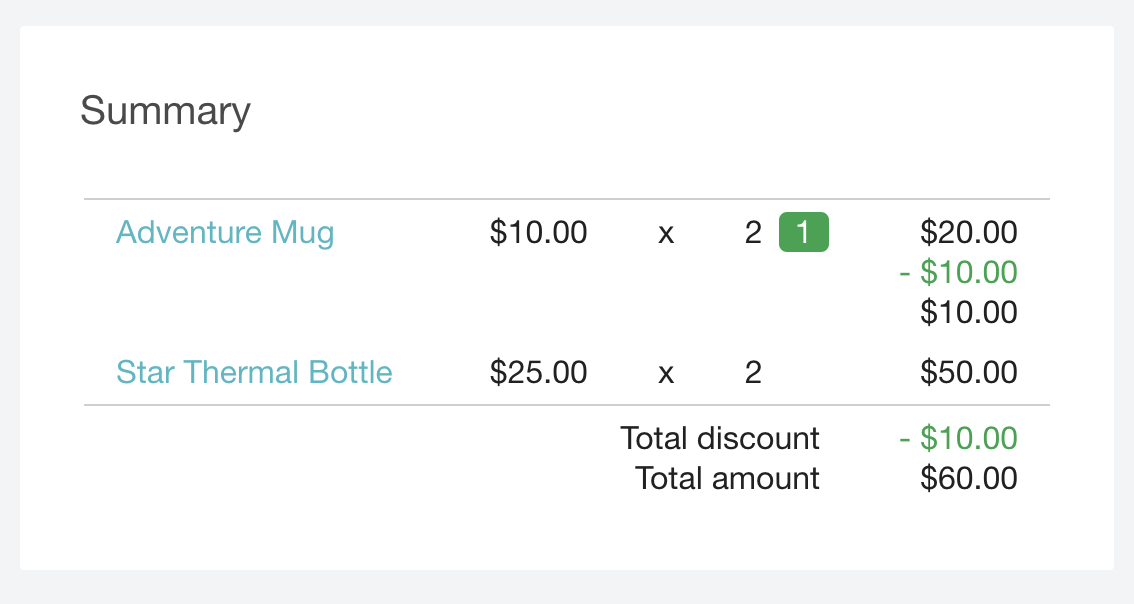 "total_discount_amount": 1000, // The sum of all order-level and all product-specific discounts. In this case, this is this the full price for the free item. This should be shown to the end-customer.