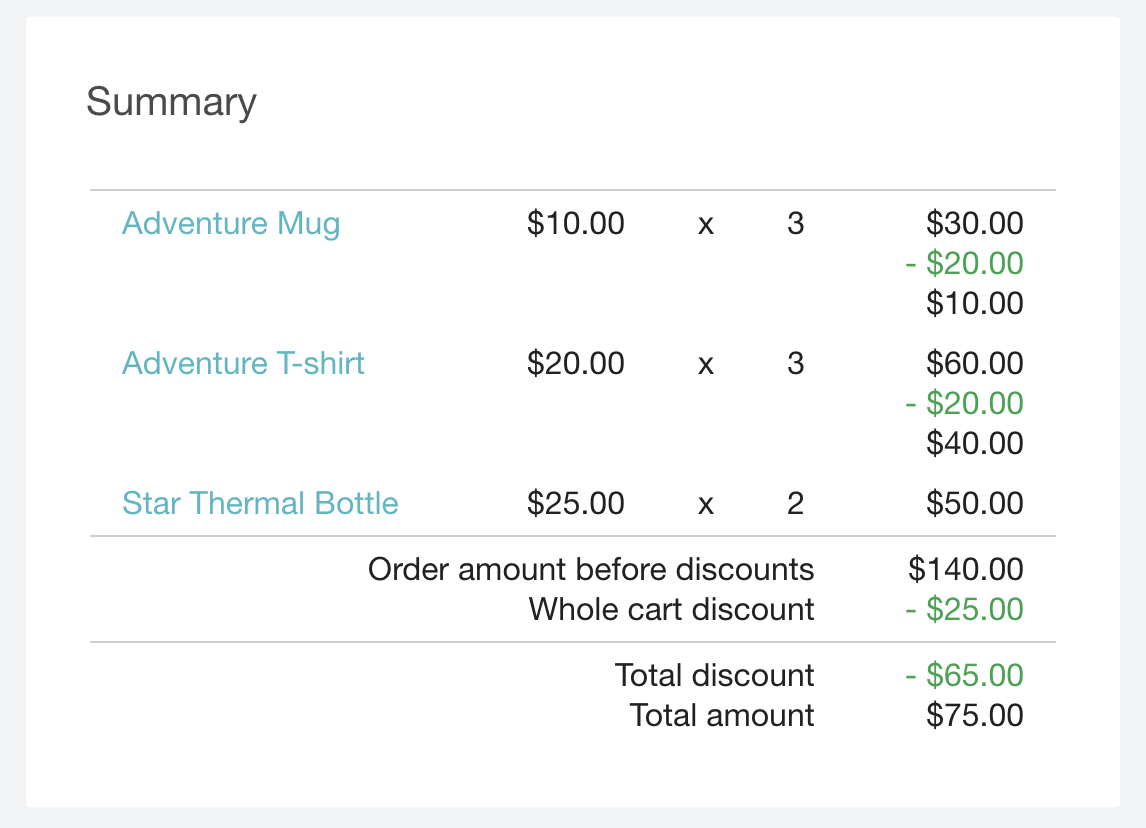 "total_discount_amount": 6500, // The sum of all order-level and all product-specific discounts. This should be shown to the end-customer.